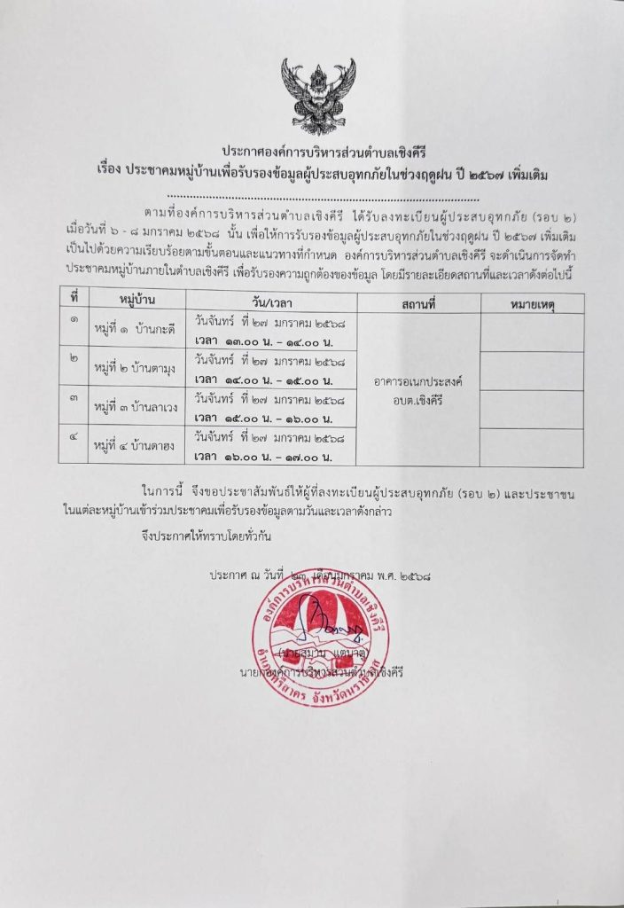 องค์การบริหารส่วนตำบลเชิงคีรี ขอประชาสัมพันธ์ เรื่องประชาคมหมู่บ้านเพื่อรับรองข้อมูลผู้ประสบอุทกภัยในช่วงฤดูฝนปี 2567